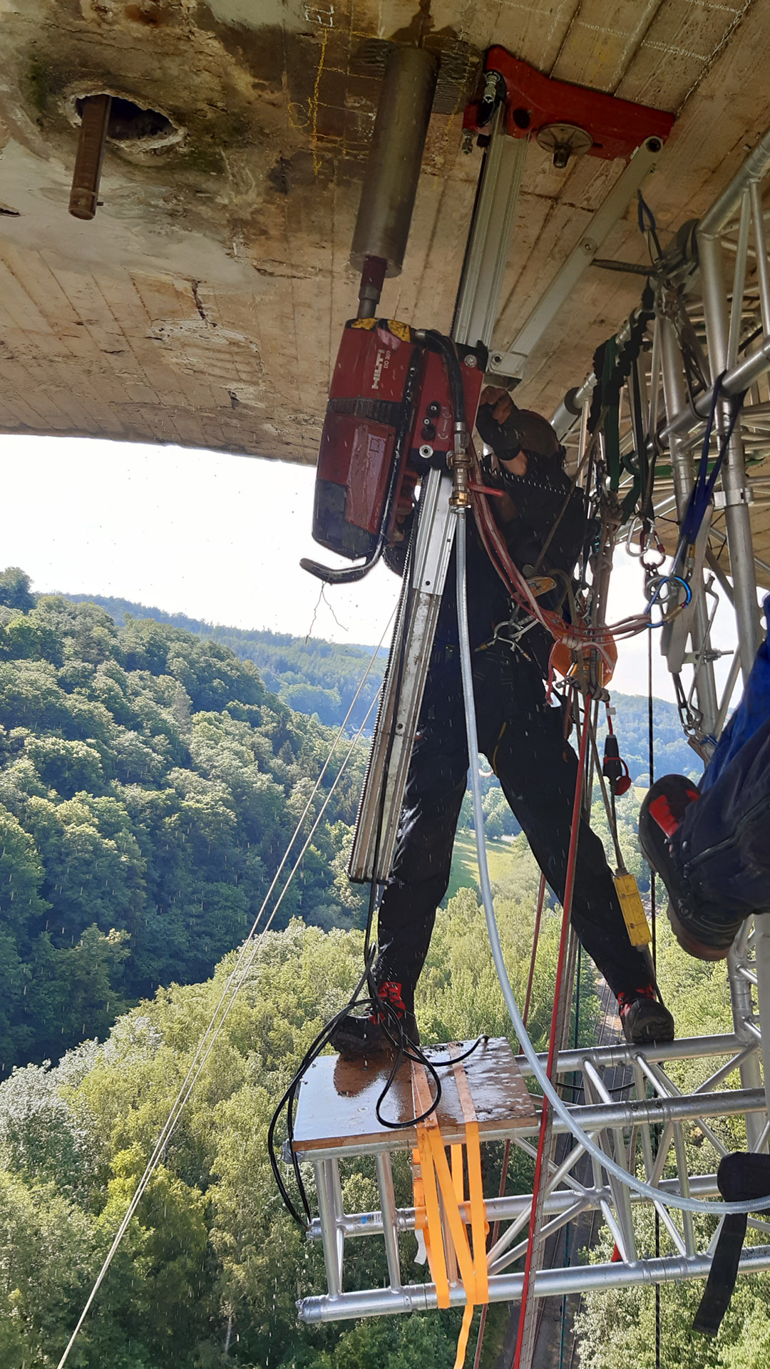 - Kernbohrarbeiten zur Erkundung des Bauwerkszustandes mittels Traversensystem in 60m Höhe unter der Elstertalbrücke bei laufendem Bahnbetrieb