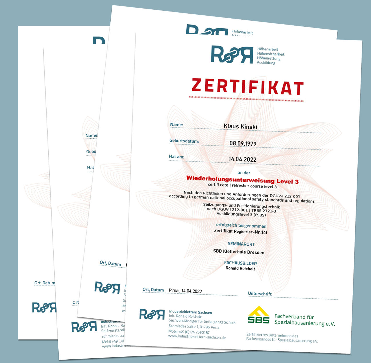 Ronald Reichelt von Industrieklettern Sachsen ist seit 2016 anerkannter Zertifizierer. Der Fachverband für Spezialbausanierung hat Herrn Reichelt 2016 für die Ausbildungen Level 1, Level 2 und Level 3 der Industriekletter-Ausbildung innerhalb des FSBS e.V. zugelassen.